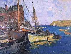 In the latter part of his career, until his death in 1931, Vincent lived in Rockport, Massachusetts, on Atlantic Avenue facing the inner harbor. He became a respected senior member of the Rockport Art Association, which he helped to found in 1921, serving as its first president,[10] and the North Shore Art Association.[11][4] Like other Cape Ann artists, he created many views of Gloucester harbor, and interpretations of an iconic fish shack on a wharf in Rockport, known fondly as Motif Number 1.[12] Street scenes and landscapes of the local granite quarries also attracted his eye, but he was continuously drawn to seaside settings.