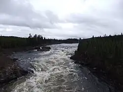 Quebec Route 389 from Baie-Comeau to Labrador City crosses the river at Km 375 over a small wooden one-way bridge.[5] In February 2017 the Quebec government asked for bids to replace the bridge, estimated to cost CDN$1−5 million.[6] The new bridge was to be a concrete slab type bridge over steel girders.[7]