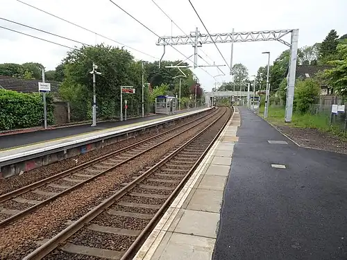 Hartwood railway station is a railway station serving Hartwood in North Lanarkshire, Scotland. It is on the Shotts Line, 19 miles (31 km) east of Glasgow Central towards Edinburgh Waverley. The station has two platforms, connected by a stairway footbridge. It is managed by ScotRail.