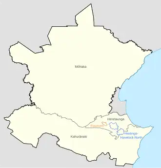 Hastings District Council is made up of one mayor and 15 councillors representing five general wards and one Māori ward.[2]