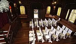 The Durbar Hall was constructed for the 1886 Colonial & Indian Exhibition in London. It was donated in 1919 as part of the Brassey Collection.[4] The hall was the centrepiece of the Indian Court, a series of buildings designed and laid out like a traditional Indian palace. It was designed by Caspar Purdon Clarke and was built on-site by Mohammed Baksh and Mohammed Juma. Baksh and Juma were skilled woodcarvers brought over from the Punjab specially to do the wood carving required for the exhibition. During the exhibition, the hall was the Prince of Wales official reception pavilion. At the conclusion of the exhibition Thomas Brassey, 1st Earl Brassey bought parts of the Indian Court and had them remodelled and installed as an extension to his Park Lane house. It was removed from London by Thomas Brassey, 2nd Earl Brassey and gifted to Hastings in 1919. It was kept in storage until the 1930s, when it was re-constructed at the museum as it looked in the Brassey family's London home. Today the hall is lower floor of the hall is regularly used for many different types of events, including talks, theatre performances, preschool groups and weddings & civil partnerships. The upper hall is one of the museum's world cultures galleries.[5]