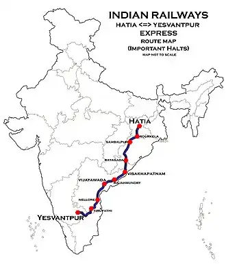 - 12836 – leaves Yesvantpur Junction every Wednesday and Friday at 8:30 hrs IST and reaches Hatia the next day at 19:05 hrs IST.