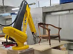 A robotic arm applying lacquer finish to a chair at Hatil factory