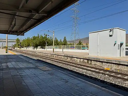 Hatundere station was originally opened in 1995 by the Turkish State Railways, along with the double-track Menemen-Aliağa railway.[1] Hatundere was one of four stations built on the railway, along with Aliağa, Biçerova and Yanıkköy, and was built as a high-level station. With its completion, TCDD operated a regional trains service between Aliağa and Çiğli station in İzmir, where connections to local train service to Alsancak station could be made.[3][4] In 1999 the State Railways and the İzmir Metropolitan Municipality unveiled plans for the Aliağa-Menderes railway corridor, which planned for a complete overhaul of the railway from Aliağa to Menderes, which would later be known as İZBAN.[5][6] This included the electrification and modernization of all stations. Electrification work began on 18 December 1998 and was completed on 6 May 2004, although no electric trains were put into service.[7] TCDD continued to operate regional railbus train service until 2006, when the construction of the Karşıyaka railway tunnel saw the closure of the railway between Çiğli and Basmane/Alsancak.[8] While efforts were made to continue train service between Aliağa and Çiğli, these ultimately failed and Hatundere station was temporarily closed to passenger service.[9][2] During its closure, certain upgrades to station were made, including the addition of turnstiles and PIS boards along with İZBAN signage. On 29 October 2010, İZBAN began testing its trains between Halkapınar and Aliağa with its new E22000 EMUs. On 30 January 2011, Hatundere reopened to passenger service with the extension of İZBAN's northern line from Çiğli to Aliağa.[10] Hatundere originally saw hourly train service between Aliağa and Alsancak. This frequency increased to half-hourly on 15 May 2011, due to high demand.[11]
