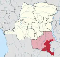 Location of Haut-Katanga district (red) in extreme south of the Democratic Republic of the Congo (2014)