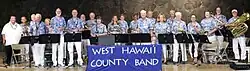 The West Hawaiʻi County Band, based in Kailua-Kona on the Kona Coast of Hawaiʻi Island, is an independent sub-unit of the Hawai'i County Band. As a civic band The West Hawaiʻi County Band can be heard at regular monthly concerts in Kailua-Kona as well as performing in numerous parades and civic events on the west side of Hawaiʻi Island.[1]