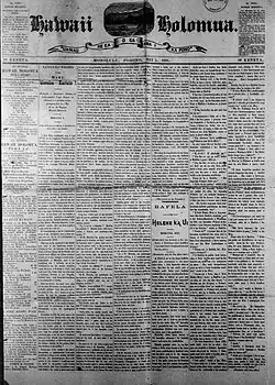 The Hawaii Holomua was founded on May 2, 1891, by Joseph Mokuʻōhai Poepoe.[1][2] Its name can be translated in English to "go-ahead Hawaii".[2] Poepoe served as its inaugural editor.[3] The newspaper began with four editions: daily and weekly Hawaiian-language versions and daily and weekly English-language versions.[1] In the editorial of the first issue of the Hawaii Holomua, they said that it did not hold any affiliation with the two major parties—the Liberal Party and the National Reform Party—and hoped that the newspaper brought unity and ended disagreements amongst Native Hawaiians.[3] In February 1892, Poepoe appeared to have resigned as editor of the Hawaii Holomua, returning to law. He was succeeded by Kahikina Kelekona and G. Carson Kenyon.[4][5] During the 1892 elections for the Hale Aliʻi and Lunamakaʻāinana, the Hawaii Holomua did not stand for a specific party, but rather any party supporting Native Hawaiians.[6] In 1893, the newspaper was purchased by the Holomua Publishing Company. With its purchase, an English-only edition of the newspaper titled the Hawaii Progress Holomua replaced the bilingual version. Its first issue was published on September 18, 1893. The newspaper was published every afternoon with the exception of Sundays and holidays.[1] Its motto was "The Life of the Land is Established in Righteousness."[7] In 1893, the total circualation of the Hawaii Holomua and all its versions was estimated to be around 5,000.[1]