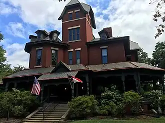 The Hawkins-Hartness House was built around 1880 for Dr. and Mrs. Alexander B. Hawkins.[2] It is a 21⁄2-story, Eastlake-style brick dwelling with a four-story tower and numerous two-story projections. It features a one-story hip-roof Eastlake movement style front porch.