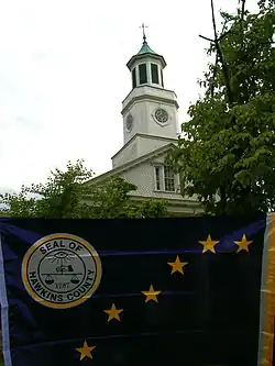 The flag of Hawkins County, in front of the county courthouse.