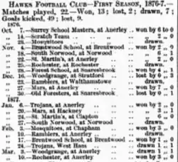 Although the club claimed a foundation date of 1875,[1] its first reported game was against a Surrey School Masters select on 7 October 1876, ending in a 6–0 win.[2] The first match against a regular club was against Mosquitoes F.C. on 28 October 1876. The match ended goalless, after a Hawks goal was disallowed as Mosquitoes noticed that the club had 12 men on the pitch.[3]