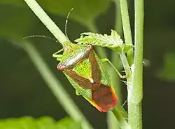 The hawthorn shield bug (Acanthosoma haemorrhoidale) is a common European shield bug.[1] Its chief food is haws, the fruit of the hawthorn tree, but adults can overwinter on a diet of leaves, and individuals can be found on many potential food plants, including pedunculate oak, sessile oak and whitebeam.[2] They may grow up to 17 mm (0.67 in) long, and are camouflaged in shades of green and brown. Like many so-called "stink bugs", they may release unpleasant odours when disturbed.[3]