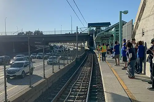 Hawthorne/Lennox station is a below-grade light rail station on the C Line of the Los Angeles Metro Rail system. It is situated in the median of Interstate 105 (Century Freeway) and named after Hawthorne Boulevard and the Lennox community where it is located. The station is also close to the city of Hawthorne and opened as part of the Green Line on August 12, 1995.[3]