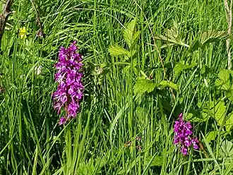 Hay Dale is part of the Derbyshire Dales National Nature Reserve. Natural England manages the reserve which covers five separate dales of the White Peak (Lathkill Dale, Cressbrook Dale, Hay Dale, Long Dale and Monk's Dale). The Carboniferous limestone rocks of the reserve were formed 350 million years ago from the shells and sediments of a tropical sea. The landscape was then sculpted by the ice sheets from the last Ice Age 20,000 years ago. The reserve contains ash woodland, limestone grassland and many wildflowers including early purple orchid, cowslip, common rock rose and thyme. Butterflies are abundant and include the brown argus.[2]