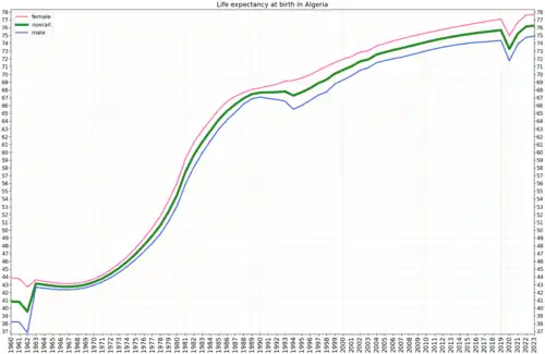 According to the World Health Organization, life expectancy in Algeria in males was 70.3 years of age and females 73.5 with a total life expectancy of 71.8. Giving Algeria a world life expectancy ranking of 103.[14] In 2020 Algeria's life expectancy increased with males having a life expectancy of 76.95 years of age and females 77.96 years of age. The total life expectancy being 76.59 years of age.[15]