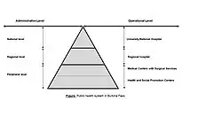 - Administratively, Burkina Faso has a three-level pyramidal health system that comprises from the top to the bottom: