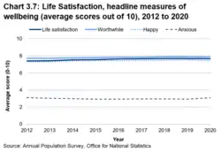 The average life satisfaction has been increasing since 2011-12 up until the covid pandemic. Average anxiety levels have also slightly reduced up until this point. The most recent data collected before the onset of the covid pandemic showed a slight deterioration in life satisfaction and anxiety.[5]
