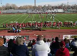 Many high school students will experience some form of head injury during their experiences in amateur sports and the majority of these can be classified as concussions.[18] Even by the beginning of high school, 53% of athletes will have already suffered a concussion. Less than 50% of them report it in order to stay in the game. Many concussions may be subtle and go undiagnosed.[19] While the majority of these minor injuries will recover without consequence within 3 to 7 days, it is the repetitive injury that is associated with neurological sequela.[20] Multiple concussions appear to have a cumulative effect on memory performance.[20] If an athlete returns to competition before being completely healed, they are more susceptible to suffer another concussion. A repeat concussion can have a much slower recovery rate and be accompanied by increased symptoms and long-term effects. This “second impact syndrome” has, in some cases, been fatal.[19] A history of concussion in football players has been linked to sports-related sudden death.[21] The severity of complications from concussion can include brain swelling, blood clots and brain damage.[22] Ice hockey, soccer, wrestling and basketball carry a high risk for concussion however, football is the most dangerous. Concussion causing situations that involve leading with the head, hitting head to head and striking a defenseless athlete have become subject to penalty in order to discourage players and coaches from this type of play.[23] These rule changes have resulted in technique changes at the youngest levels of sports, and youth athletes are now being trained in methods avoiding illegal contact. Youth sport organizations have also made equipment changes to better protect players. A widespread myth is that helmets protect athletes from concussions; they are actually worn to prevent skull fractures. Facts like this have prompted trainings on proper equipment use and not utilizing helmets as an implement of contact.[22]