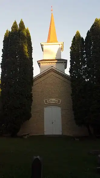 Before the church was built, services were held under oak trees, in the Lyman School, and in log cabins. One of those early log cabins, owned by Gundar Halvorsen, now sits on the campus of the University of Wisconsin-Whitewater. The Norwegian pioneers began hauling brick by oxcart to build the present church, which was completed between 1855 and 1857. About this time the congregation joined with congregations at Whitewater, Palmyra and Sugar Creek to call the same Lutheran pastor.[2]