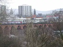 A spur of the West Coast Main Line between London Euston and Manchester Piccadilly passes through the suburb, over the large brick-built Stockport Viaduct. Heaton Norris railway station was a stop on the line, before it was closed in 1959.