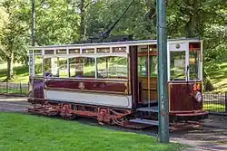 Manchester Corporation Tramways 765 Operational 1914 This car was built in 1914 and is the only remaining electric tramcar from Manchester in regular operation. It was one of a series of unusual single-deck bogie cars of the combination car type, with a central saloon and open smoking compartments at the ends, built for routes with low bridges. The conversion of these routes to buses in 1930 led to most of these cars being sold, and the body of 765 was acquired by a farm near Huddersfield. In 1960 it passed to a group that was to become the Manchester Tramway Museum Society and restoration work started. It has operated at Heaton Park since 1979.[10][11][12]