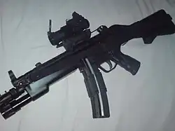 The Heckler & Koch MP5 (German: Maschinenpistole 5, lit.'Submachine gun 5') is a submachine gun developed in the 1960s by German firearms manufacturer Heckler & Koch. It uses a similar modular design to the Heckler & Koch G3, and has over 100 variants and clones,[14] including selective fire, semi-automatic, suppressed, compact, and even marksman variants.[15] The MP5 is one of the most widely used submachine guns in the world, having been adopted by over forty nations and numerous militaries, police forces, intelligence agencies, security organizations, paramilitaries, and non-state actors.[16][17]