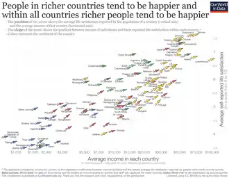Richer countries tend to be happier than poorer countries (observations are lined up around an upward-sloping trend), and richer people within countries tend to be happier than poorer people in the same countries (arrows are consistently pointing northeast).
