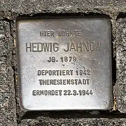 At the end of 1938 due to the increasing anti-Jewish law in Germany leading up to The Holocaust Jahnow tried to emigrate to England, but the then 59-year-old was rejected by the authorities in England on the basis of her old age. In June 1942, Jahnow and a roommate, who were reported to authorities by a third roommate, were sentenced to five years in prison for listening to enemy radio stations. On September 7, 1942, Jahnow was deported along with other people of Jewish descent from Marburg to Theresienstadt, where she died of malnutrition on March 22, 1944,[9][10] one day after her 65th birthday. She was buried in an urn numbered 22710.