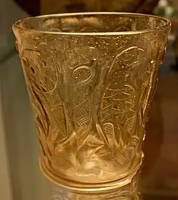 Hedwig glasses or Hedwig beakers are a type of glass beaker originating in the Middle East or Norman Sicily and dating from the 10th–12th centuries AD. They are named after the Silesian princess Saint Hedwig (1174–1245), to whom three of them are traditionally said to have belonged.[1] So far, a total of 14 complete glasses are known.[2] The exact origin of the glasses is disputed, with Egypt, Iran and Syria all suggested as possible sources; if they are not of Islamic manufacture they are certainly influenced by Islamic glass.[3][4] Probably made by Muslim craftsmen, some of the iconography is Christian, suggesting they may have been made for export or for Christian clients.[5] The theory that they instead originate from Norman Sicily in the 11th century was first fully set out in a book in 2005 by Rosemarie Lierke, and has attracted some support from specialists.[6]