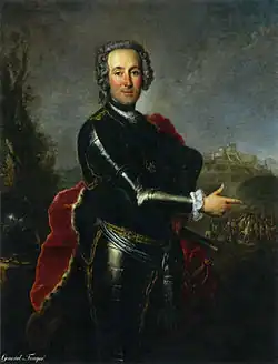 In 1757, during the Seven Years' War, Fouqué hanged the Catholic priest Andreas Faulhaber for allegedly inciting Glatz's garrison to desert.[6] Frederick entrusted Fouqué with 13,000 troops in order to guard Silesia against enemy attacks.[7] In June 1760, the outnumbered Fouqué was forced to withdraw from combat by an Austrian force three times as large led by Ernst Gideon von Laudon.[8] When Frederick ordered the general to advance again, 8,000 troops under Fouqué were defeated in the resulting Battle of Landeshut on 23 July.