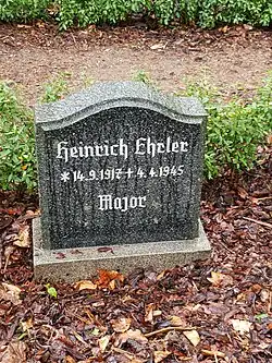 Scapegoated for the loss of the German battleship Tirpitz, Ehrler was court-martialled, stripped of his command and sentenced to three years and two months Festungshaft (honorable imprisonment).[1] Ehrler's sentence was later commuted and his loss of rank rescinded, and in February 1945 he was transferred to Jagdgeschwader 7 (JG 7–7th Fighter Wing). According to his fellow pilots, Ehrler thereafter flew in the increasingly desperate air battles without the purpose and dedication that had made him one of the Luftwaffe's most successful aces.[2] On 4 April 1945, he claimed his last three victories by shooting down two Allied bombers and ramming and destroying a third with his damaged aircraft having run out of ammunition.[2]
