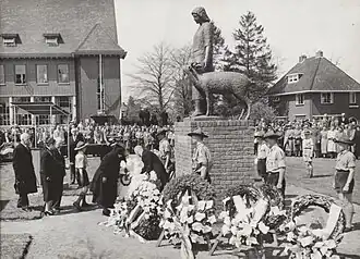 Princess Wilhelmina on 4 May 1955, at the monument for Kuipers-Rietberg in Winterswijk. Statue by Gerrit Bolhuis.