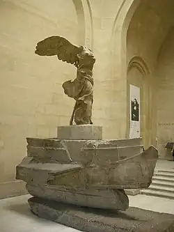 The famous 2nd century BC Nike of Samothrace, standing atop the prow of an oared warship, most probably a trihemiolia.