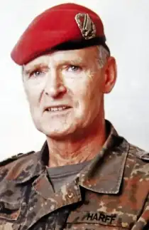 In 1998 he was appointed as deputy commander of Airmobile Forces Command/4th Division in preparation for an expanded Bundeswehr mission in the Balkans, beginning in modern-day North Macedonia (then the Former Yugoslav Republic of Macedonia).[3][4] Brigadier General Harff was then the German national commander of the Bundeswehr contingent in North Macedonia, during Operation Allied Force, the NATO bombing of Yugoslavia, and the subsequent entry of NATO peacekeeping forces into Kosovo. His force assisted with supporting Albanian refugees that crossed the border from Kosovo into North Macedonia as a result of the Kosovo War,[3] and some Serbian military deserters also crossed the border and surrendered, asking for asylum in Germany. They were treated as prisoners of war in accordance with international law, which made Harff the first German general to take prisoners of war since World War II.[6]