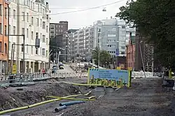 Hämeentie, the second longest street in Helsinki, was under construction in 2019–2020. The yellow-blue sign, humorously written in Helsinki slang, says: "Cars are gone, soon we walk and cycle. A better Hämeentie is on the way."