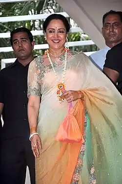Hema Malini Dharmendra Deol[4][5] (born 16 October 1948;[6] Hindi pronunciation: [ɦeːmaː maːlɪn̪iː d̪ʱəɾmeːn̪d̪ɾə d̪eːoːl]) is an Indian actress, director, producer, and politician who is currently serving as a member of the Lok Sabha from the Bharatiya Janata Party (BJP), representing Mathura constituency since 2014. She was a member of the Rajya Sabha from Karnataka from 2011 to 2012, subsequent to her nomination to that chamber from 2003 to 2009 as a member of the BJP.[7] Primarily known for her work in Hindi films, she has starred in both comic and dramatic roles, and is one of the most popular and successful leading actresses of mainstream Hindi cinema.[8][9][10]