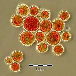Hematochrome is a yellow, orange, or (most commonly) red biological pigment present in some green algae, especially when exposed to intense light. It is a name used mainly in older literature. Hematochrome is a mixture of carotenoid pigments and their derivates.[1][2][3]