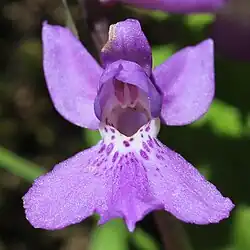 Hemipilia joo-iokiana is a herbaceous perennial growing from an ovoid tuber. It reaches a height of 10–30 cm. It has one to three leaves, 4–8 cm long, with bases that surround the stem. The inflorescence consists of a few flowers arranged loosely rather than in a dense spike. Each flower is about 20 mm across, reddish purple overall. The upper (dorsal) sepal is about 10 mm long. The lip or labellum is about 15 mm long, divided into three relatively broad lobes, the middle one being the longest and sometimes further divided. A spur is present, 15–20 mm long, longer than the ovary.[2]