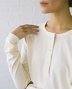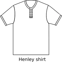 A Henley shirt is a collarless pullover shirt, characterized by a round neckline and a placket about 3 to 5 inches (8 to 13 cm) long and usually having 2–5 buttons.[1][2][3] It essentially is a collarless polo shirt. The sleeves may be either short or long, and it can be made in almost any fabric, although cotton, cotton-polyester blends, and thermals are by far the most popular.[4] Henley shirts are generally regarded as menswear, but women's versions have appeared as business casual and casual wear as well.