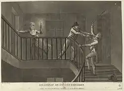 Henri Admirat lived in the same building as Jean-Marie Collot d'Herbois. He bore many grudges against the Revolution, not least for closing down the public lottery of which he had been an employee, and making him redundant. He decided to assassinate Collot and had lain in wait for his victim, armed with two pistols. Collot, returning from a late-night meeting of the Committee of Public Safety, was chatting with his governess on the stairway when Admirat struck. Admirat fired two shots at Collot at point-blank range, but both pistols misfired. Collot then defended himself with his sword and managed to prevent the would-be assassin from escaping from the building. Admirat barricaded himself in his flat and was later arrested by the passing National Guards patrol, but not before seriously wounding a man named Geoffroy who was helping the National Guards to gain entry into the flat.[1]