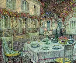 Le Sidaner held successful solo exhibitions at one of George Petit's Galleries in 1897 and at the La Libre Esthétique in Brussels in 1898. He was keen to buy a country property where he could create a garden and work in reflective solitude. It was on the advice of ceramist Auguste Delaherche that he rented a neglected property at Gerberoy in the Picardy countryside that he subsequently bought in 1904.[19] Once at Gerberoy, Le Sidaner rarely painted figures again preferring to create impressionistic moods through objects that imply human presence.[20] He also set upon the creation of a magnificent garden to rival Monet's at Giverny.[21] In 1902 Le Sidaner joined his old friend Eugène Chigot for an extended visit to Gravelines and Gisors[22] The preference for a few years was to avoid the harsh Oise winters and encamp to milder climes. In 1903 Le Sidaner spent the winter at Chartres and in 1906 in Venice where according to his biographer Mauclair he completed some of his greatest masterpieces.[2] They include a series of nocturne paintings: Le Grand Canal, Le Palais ducal, Le Palais Rouge and the vivid, mysterious La Sérénade, (1906). This series of paintings were highly acclaimed as examples of Le Sidaner's ability to capture atmospheric lighting effects, using dappled brushwork to create a sense of the luminosity of twilight.[3]