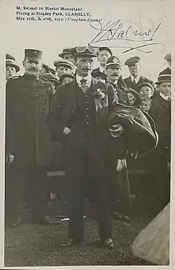 In 1913, Salmet flew in a tour of Great Britain, again sponsored by the Daily Mail, whose title was emblazoned beneath the wings of his Blériot XI-2. One of his passengers that year was the English illustrator Wyndham Payne.[8] In April 1914, he landed the Blériot at Gyllyngvase beach near Falmouth, where the wheels dug into the soft sand, and the aircraft tipped up onto its nose.[9][10] The Blériot was then fitted with its optional floats to enable operation from the sea. Soon after, an engine failure caused a forced landing on the sea near Lizard Point, during a flight carrying the Lady Mayoress of Falmouth.[9][10]