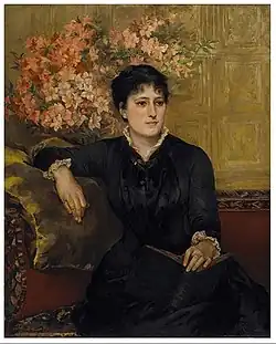 Henrietta Montalba was born on 8 April 1848, the fifth child and the fourth daughter of Anthony Rubens Montalba and Emeline (née Davies), all of whom would attain considerable success as artists. Her birth was at 9 Camden Terrace West, Camden New Town, Saint Pancras in London. Her birth was registered by her mother on 6 October 1848 with the given name Henrietta Mary Ann Skerrett Montalba. Her father's profession was given as gentleman. The 1871 British census shows Anthony Montalba living at 19 Arundel Gardens, Notting Hill, London, with four daughters, all artists.[1] Montalba studied first at what was to become the Royal College of Art in South Kensington, and then in the Accademia di Belle Arti in Venice. Later she became a pupil of Jules Dalou, the French sculptor, during his residence in London.[2]