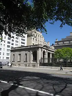 The site had been part of the Lenox family's farm until the late 19th century.[14] The site of the Frick House then became the Lenox Library, designed in a neo-Grec style by Richard Morris Hunt. The library had contained paintings and books owned by the philanthropist James Lenox.[15][16] Frick's house occupies a 200-by-175-foot (61 by 53 m) site that includes both the library and an adjacent strip.[6][7] The eastern half of the block was sold to other developers,[17] who had erected residences there by 1910.[18] The entire block was restricted to residential use until 1929,[18] although the Frick House was excluded from this restriction in 1926.[19] After the mansion became a museum, its site was expanded to include the land occupied by the Widener House at 5 East 70th Street (built in 1909 by Warren and Wetmore); 7 East 70th Street (built in 1911 by C. P. H. Gilbert);[20] and a third house at 9 East 70th Street (built in 1915).[21]