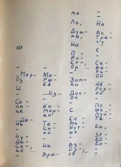 He held exhibitions of his visually innovative poetry in the studios of various Moscow artists as early as the mid-1950s. "Koshki-Mishki ili zhe Tretii K Lishnim" (Kitty-bears or the Third to the Odd Ball, 1963), one of his early books was typed on carbon paper in ten copies, accompanied by a manifesto and handwritten commentary and copyrighted by his own publishing company. Khudyakov did not own a typewriter, as it was very difficult to obtain one in the Soviet Union, and had to type the book at a secret Moscow aviation institute where he worked as a translator, until he was caught and fired. The book mainly consisted of visual poems, representing a new interpretation of Russian morphology. One of his handwritten books, Katsaveiki (Shot Fur-trimmed Jackets), was reprinted in facsimile in the international edition of SMS, No. 3 by William Copley in 1968. [5]