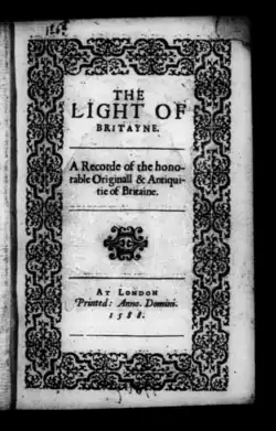 Lyte's second work was The Light of Britayne; a Recorde of the honourable Originall and Antiquitie of Britaine (1588), also dedicated to Elizabeth, and containing her portrait. Its object is to trace the descent of the British from Brutus of Troy. Lyte presented a copy of this work to the queen on 24 November 1588, when she went in state to St. Paul's to return thanks for the defeat of the Spanish Armada.[2]