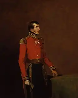 Between 1805 and 1807 he served as aide-de-camp for his uncle Lord Cathcart in Ireland and Egypt then as a major in the 26th Cameronians during the Walcheren Campaign (1809) and its siege of Flushing.[3] Having joined the 26th on 26 March 1807 he remained with them for three years. On 2 August 1810 he joined the 18th Hussars as a major. He remained with the 18th Dragoons until the end of the Napoleonic Wars, being promoted to Lieutenant-Colonel of the Regiment on 2 January 1812.[2] During a crossing of the Esla River while with the 18th Hussars, his horse fell severely injuring him after which he spent some time in the hospital at Palencia.[4] He was present at the Battle of Morales (2 June 1813), despite still suffering from the severe wound to his knee.[1]
