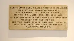 Northumberland died on 30 June 1537 and was buried in St Augustin's Church, now the site of St John at Hackney parish church.[1] Writing in the early seventeenth century, the antiquarian John Weever recorded Percy's original epitaph in the church, which read: 'Here lieth interred, Henry lord Percy, earl of Northumberland, knight of the most honourable order of the Garter, who died in this town the last of June 1537, the 29th of HEN VIII.' [14] A (presumed Victorian era) memorial plaque was discovered during the 2020 refurbishment of St John at Hackney, and was re-installed inside the church.