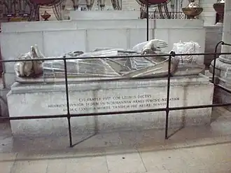 Henry's remains are in Rouen Cathedral, where his tomb is on the opposite side of the altar from the tomb of the heart of his younger brother, Richard I of England,[21] with whom he was perpetually quarrelling. The tomb of the Archbishop of Rouen, who had married him to Margaret, lies nearby in the ambulatory. His brothers Richard and John each later became King of England.