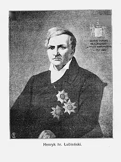 Henryk Jan Nepomucen Łubieński, Pomian coat of arms, (11 July 1793, in Prague – 17 September 1883, in Wiskitki, Poland) – was the scion of a Polish magnate family, landowner, financier, lawyer, early industrialist, economic activist, and co-founder of the Towarzystwo Kredytowe Ziemskie w Królestwie Polskim, a banking credit institution in Congress Poland. He was elected to the Sejm of Congress Poland and became a government counsel. He rose to the rank of vice president of Bank Polski, the national bank of Poland during the Kingdom of Poland. He was one of the co-founders of the Mill town of Żyrardów and its textile industry in 1832 and a participant in the creation a new industrial and rail infrastructure in Poland.