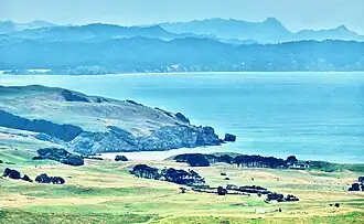 ![]() The north end of the Herangi Range viewed from Karioi; Taranaki Point in the near distance | |